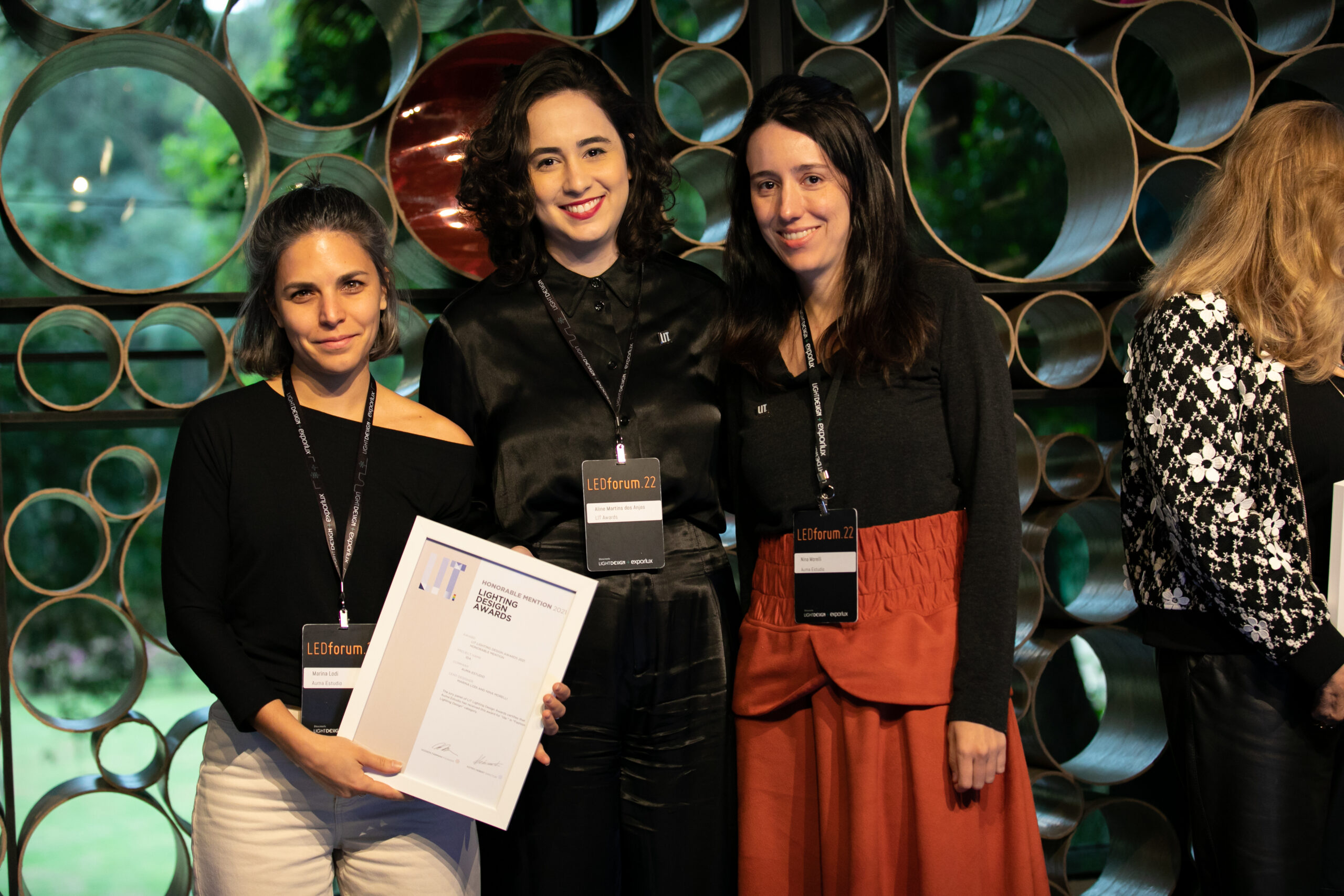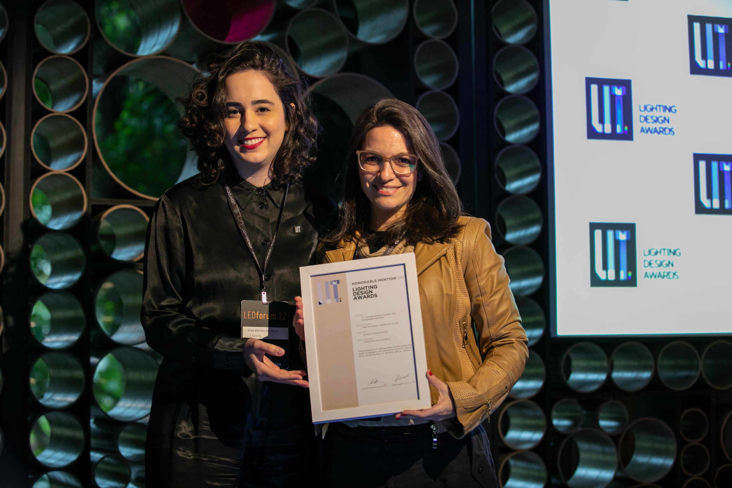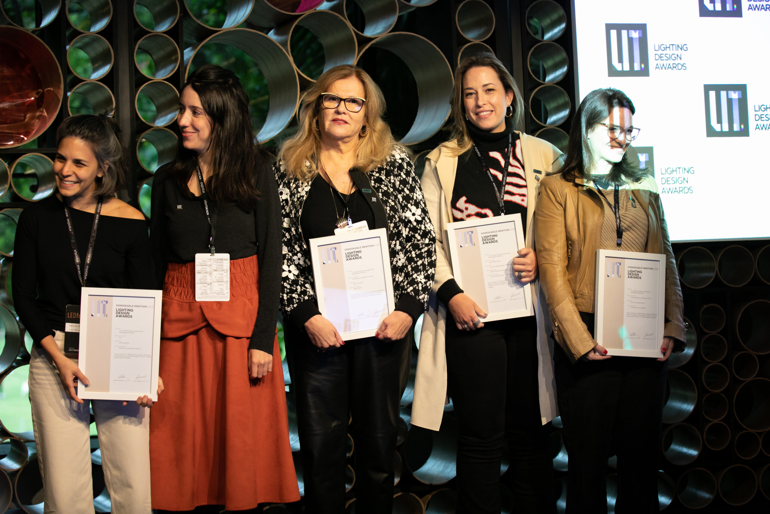 LIT Winners that received recognition at the LIT Awards Ceremony x LED Forum include: Mark Major accepting on behalf of Speirs + Major for the Gasholders London lighting design; Mariana Novaes accepting on behalf of Atiaîa Lighting Design for Letras HQ; Carlos Fortes representing his firm Estúdio Carlos Fortes for the Sauer Jewelry lighting display; Renata Fongaro on behalf of studio 220v for the LIT winning project Bar dos Arcos; Marina Makowiecky received the LIT Certificate for Allume Arquitetura de Iluminação for CASA 01; Claudia Mingrone accepting on behalf of Mingrone Iluminação for their lighting design in the Localiza Building; Ricardo Fahl with Omega Light accepting the certificate for the PEG product design; and finally, Juan Carlos Fabra received the award for his lighting design of the Hotel Hampton by Hilton located in Montevideo, Uruguay.