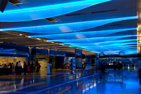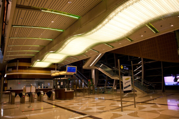 Dubai Metro – Red and Green Lines Consultant: Gulf Line International Trading Co Multiple custom lighting fixtures were designed including the “Water Wave” and the “Flying Carpet.” The “Water Wave” decorative light fixture in Burjuman Station consists of a wave-like dynamic effect created via LED edge-lit clear glass and is controlled via DMX. The custom-made fixture is made up of 21 pieces of 1-inch thick glass and each piece is made up of three segments. The wave is 40 meters long and 10 meters wide.