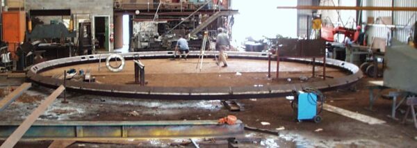 “Wheel” Aerial sculpture & chandelier foyer centerpiece 12 meters in diameter and hanging below the 48-meter high ceiling. The wheel, constructed of steel and weighing 350 kilograms, had to be assembled fully and disassembled in pieces for transport in 20m shipping containers. “I had to generate a map of which part of the wheel went into the container first so the first piece that came out could be carried to the back of the assembly area – it was important they came out in the right order!” – Dave Kavanagh