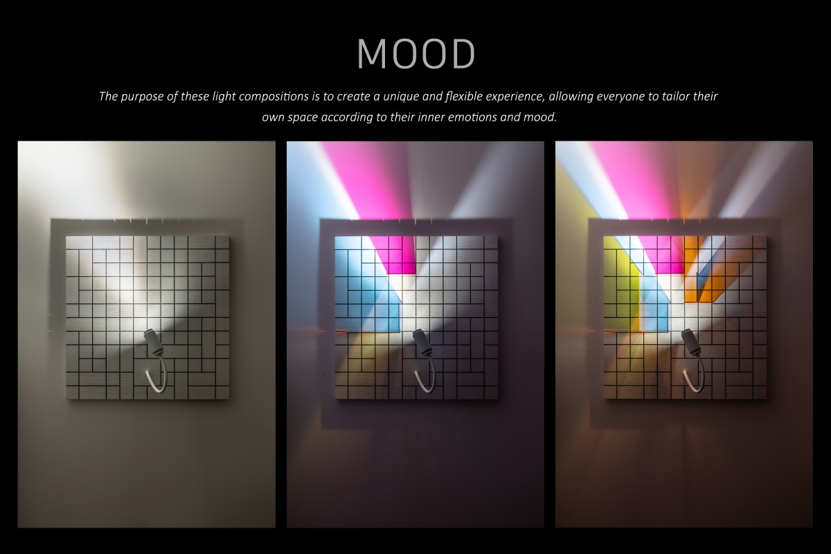 Entry DescriptionThe lighting composition 'MOOD' is one of two compositions, namely 'Mood' and 'Mini Mood'. The purpose and design principles of light compositions are similar; only their sizes and the compositions themselves differ. Primary goal in designing these lamps was to enable every interior owner to become an artist who can craft compositions of varying colors and shapes using light. This can be tailored to their mood or the day-night cycle. For example, cold shades might energize the body in the morning, while warm tones that mimic sunset could provide calm and relaxation in the evening. The purpose of these light compositions is to create a unique and flexible experience, allowing everyone to tailor their own space according to their inner emotions and biological rhythms. Also, to add more colors to interiors by changing dominant and complementary colors as desired. While the lamp maintains a minimalist appearance during the day, it transforms when lit, with colors emerging and altering the visual size of the lamp. This enables the creation of numerous unique light compositions by adjusting the positions of the light source or the plexiglass inserts. These light compositions were created as master's theses.