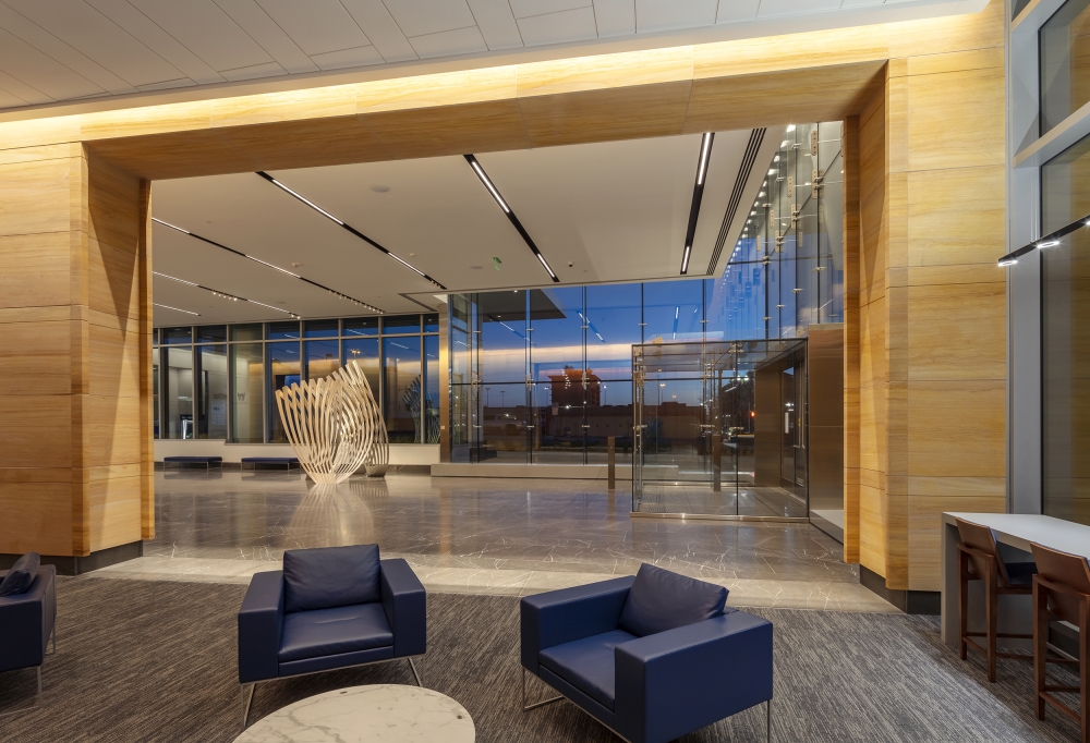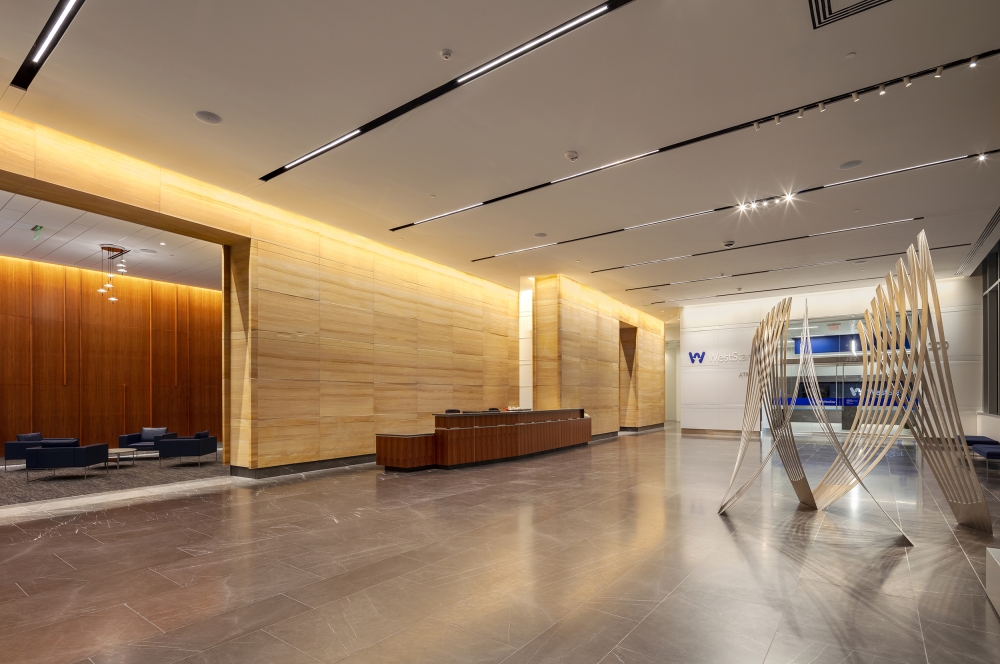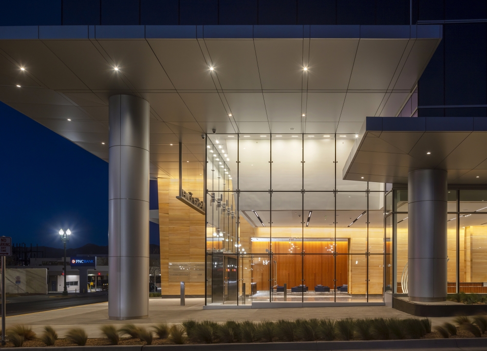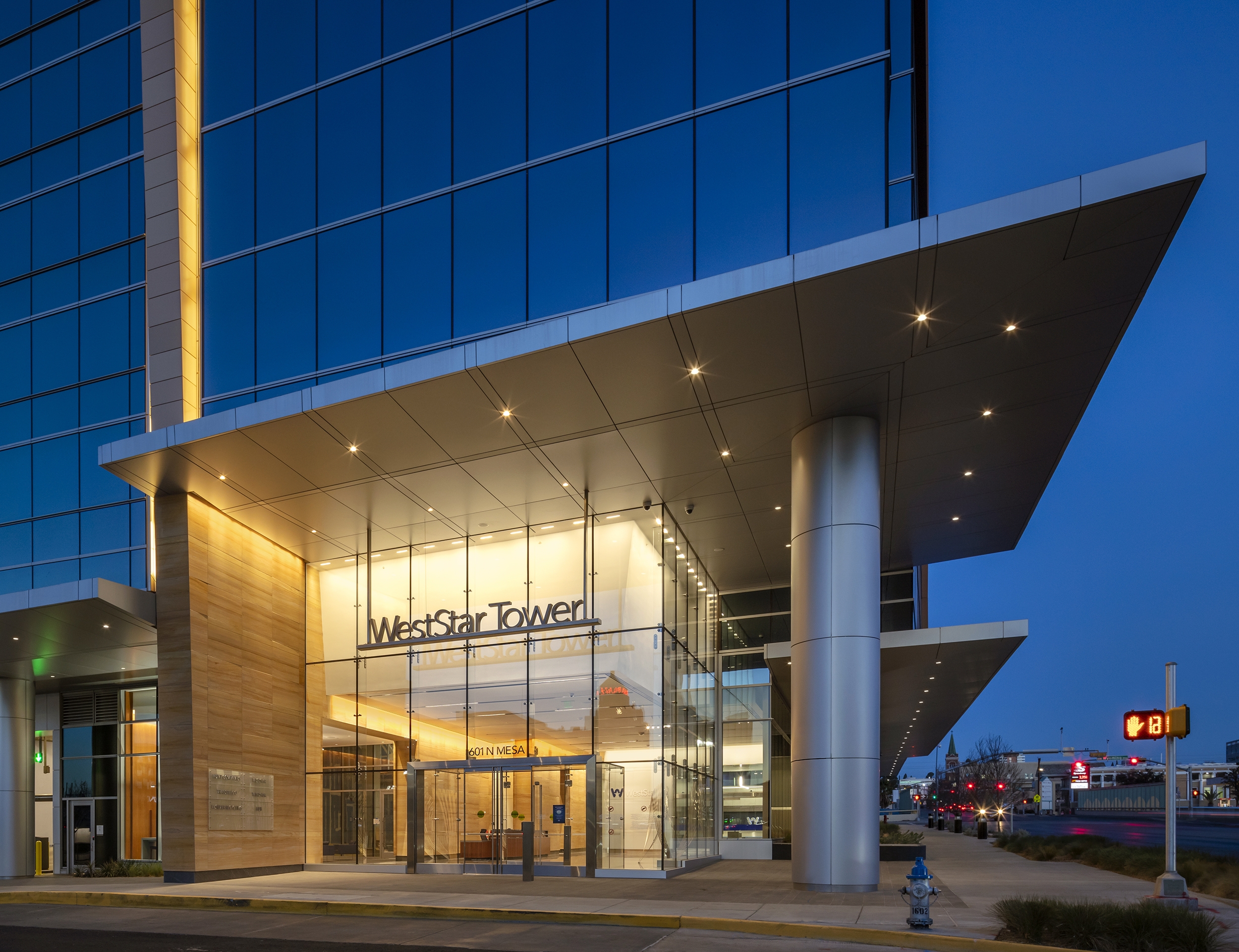 The LEED certified WestStar Tower, the first high-rise constructed in El Paso in 40 years, enjoys a unique location on the US-Mexico border. An illuminated exterior “fin” begins at the lobby entrance, travels up one side, across the roof and down the other side. This architectural feature symbolizes the border – and the connection – between the two countries. A continuous linear fixture indirectly lights the interior of the fin within a terracotta cove surface, providing a consistent warm glow from any viewing angle.