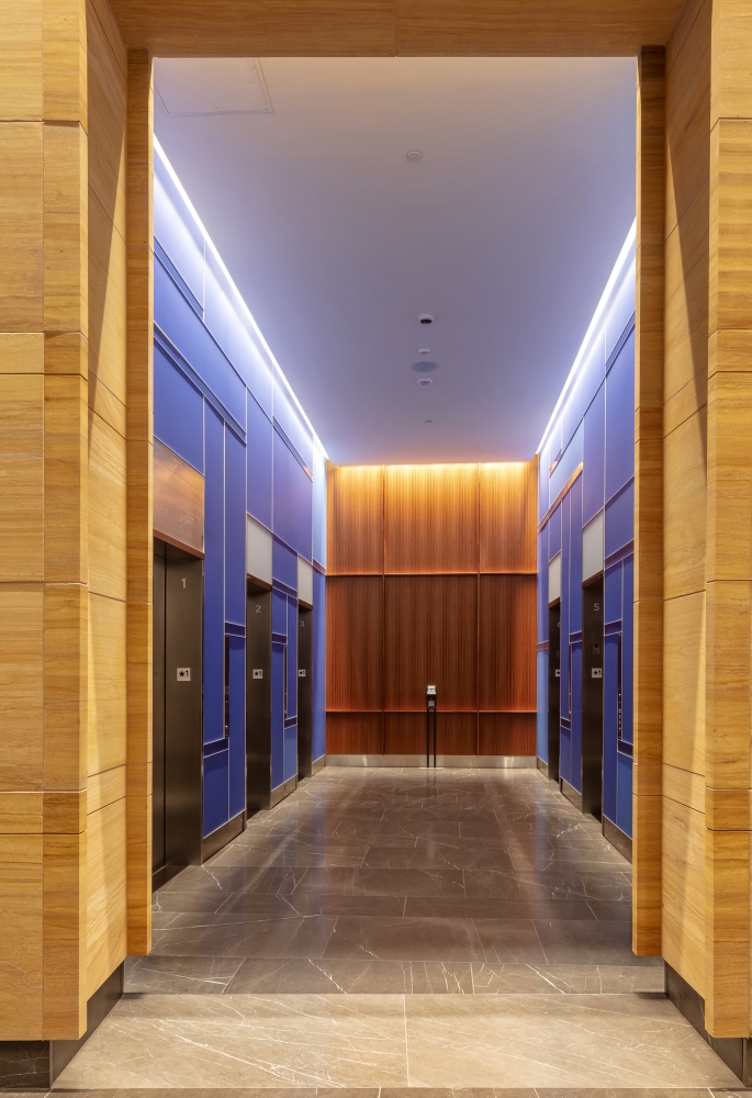 A sandstone lobby wall, emphasized by a perimeter grazing slot, echoes the warm colors and natural textures of the surrounding desert landscape. Diffuse linear fixtures provide ambient illumination, while discreet accents are aimed at the sculpture. The same detail highlights the timber end wall of the elevator lobby.