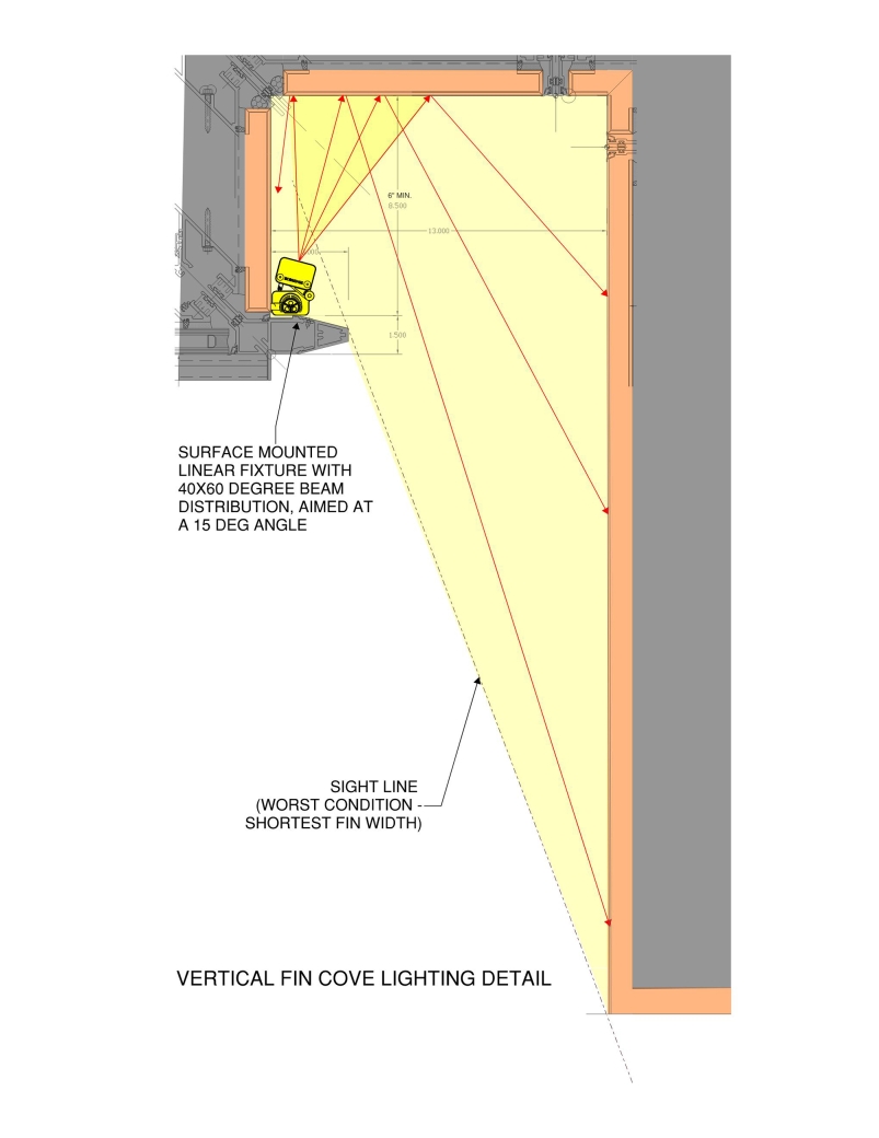 The fin’s cove lighting becomes the entry wall illumination, then continues into the lobby, dissolving the boundary between inside and out. The white heart of the tower appears inserted at the lobby’s entrance. Wall-washed on all sides, this element establishes the interior ceiling plane.