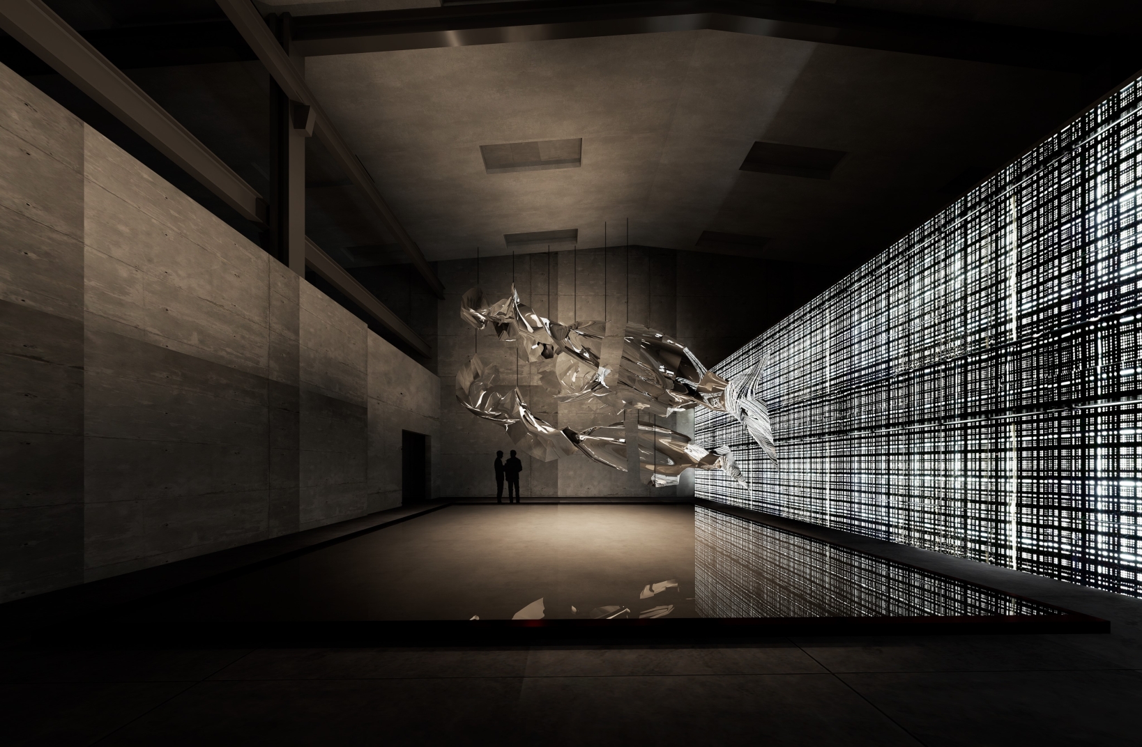 The reception area exudes a dark atmosphere, inviting visitors into a journey of discovery. Subtle, ambient lighting guides visitors through the space. Patterns of light lead them into the main gallery, where an organic glass sculpture is suspended above a pool of water.